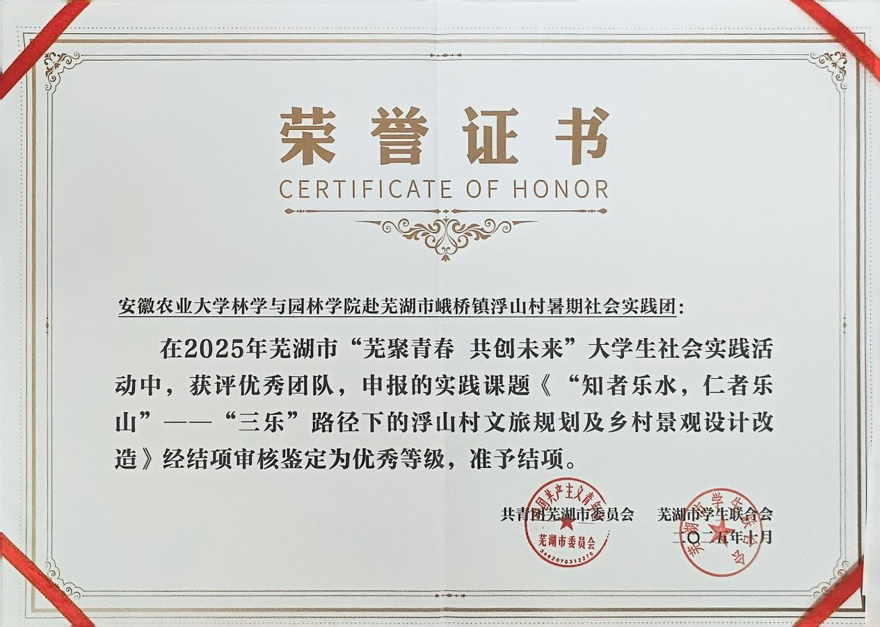 本网讯 近日,由芜湖市共青团主办的“芜聚青春 共创未来”大学生社会实践活动总结表彰仪式在芜湖市举行。林学与园林学院“知者乐水,仁者乐山”暑期社会实践团凭借扎实的调研功底、创新的实践模式与突出的乡村服务成效,从众多高校团队中脱颖而出,荣获“优秀团队”荣誉称号,其以专业力量助力乡村振兴的实践模式获主办方高度认可,受到芜湖市共青团、芜湖市政府、中国青年报以及大江资讯多家媒体报道。