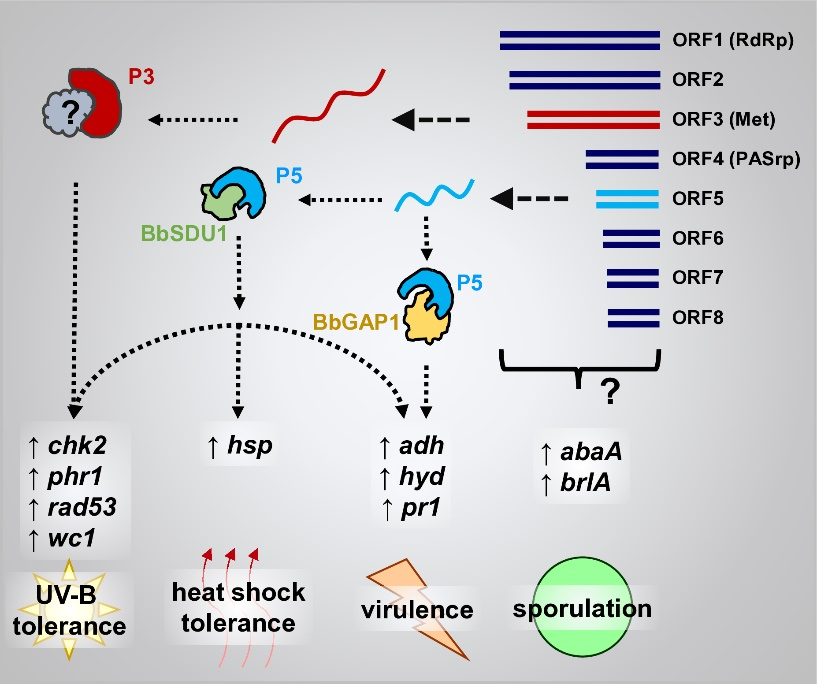 同时,本研究揭示了BbPmV4-2的编码蛋白P5能够与其宿主真菌球孢白僵菌的膜锚定蛋白BbGAP1和去泛素化酶BbSDU1发生互作,通过调控宿主的应激响应与致病相关通路,提高了宿主真菌的环境适应性,这一发现为理解真菌病毒与宿主真菌之间互利共生关系提供了新的分子证据。本研究不仅深化了对真菌病毒生物学功能的认识,也为利用真菌病毒开发新一代高效、稳定、环境友好的真菌杀虫剂提供了新思路与关键技术支撑,对推动农业绿色可持续发展具有重要意义。