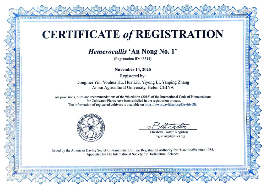 本网讯 近日,由我校牵头培育的萱草新品种“安农1号”,正式获得美国萱草协会国际登录认证(证书号:43314)。该品种由我校林学与园林学院功能花卉课题组尹冬梅教授主持,联合华艺智慧科技股份有限公司共同选育并申报,是我校首个获国际登录认证的萱草新品种,标志着我校在萱草育种领域的重要突破。