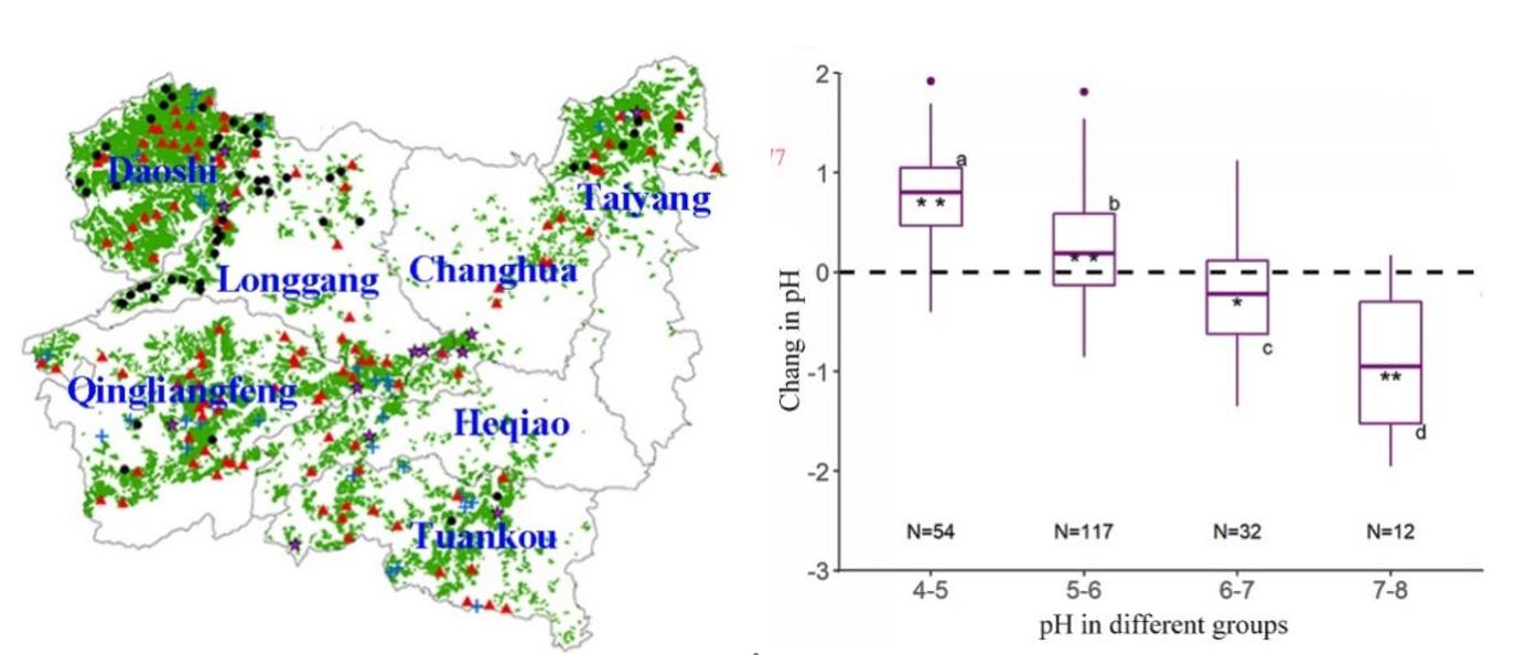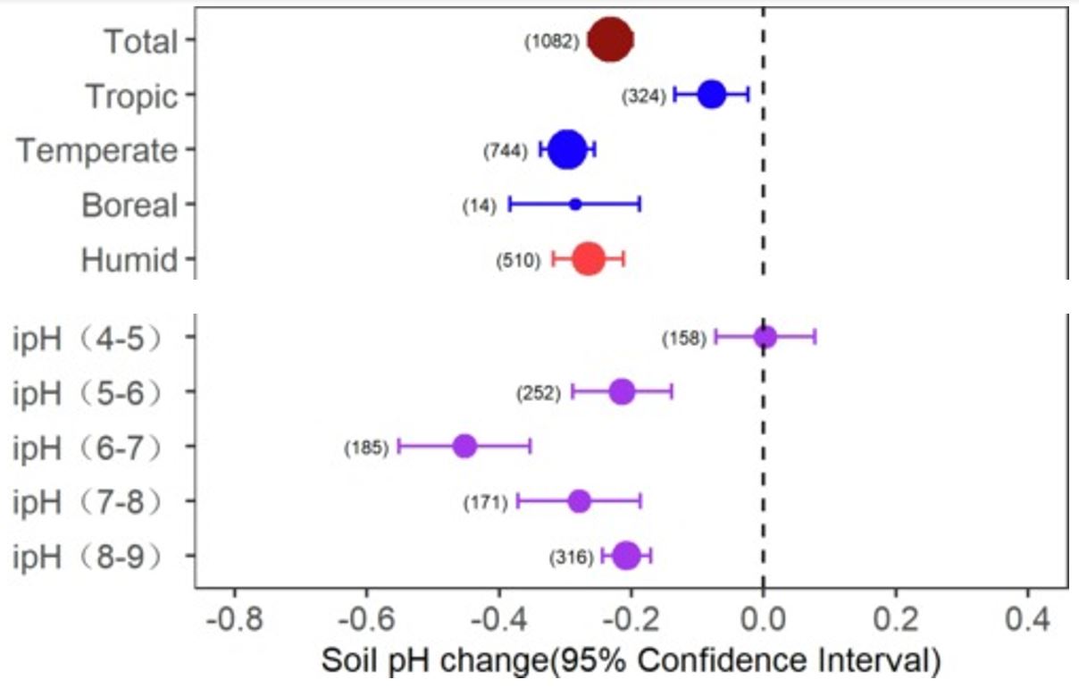 针对造林过程中土壤pH是否也存在“趋中现象”,研究团队整合了171篇文献、1082组观测数据开展全球荟萃分析,结果表明:造林后全球土壤并未出现趋中现象,而是整体显著降低,土壤pH平均下降0.23个单位。其中,中性土(pH 6–7)降幅最大,酸性土与碱性土降幅次之,强酸性土无显著变化;且酸化程度随造林年限增加而显著加剧。进一步分析显示,年均降水量、初始pH、造林年限及年均温是驱动造林后土壤pH变化的核心因子。研究结果“Acidification of soil due to forestation at the global scale”发表在期刊《Forest Ecology and Management》上。