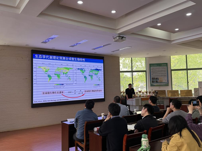 高德才副研究员作了题为《地上地下碳分配如何响应长期自然干旱》的学术报告。他借助¹³CO₂脉冲标记技术,揭示了干旱通过改变树木的“地下碳分配策略”和对磷脂脂肪酸的化合物特异性稳定同位素分析来对微生物群落进行识别,并将其与微生物细胞质中的13C标记进行比较,从而评估干旱下向根际转移的碳对利用这些根际沉积物的微生物群落所产生的影响。此外,研究还利用生态酶化学计量法,估算全球陆地生态系统的土壤微生物氮利用效率和磷利用效率。