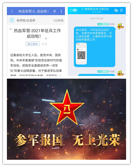 学院首先通过辅导员班主任会议上布置宣传,梳理有入伍意愿的同学进行统计;其次,通过学院网站、“易班森林”、学院官微等网络媒体积极开展宣传工作。