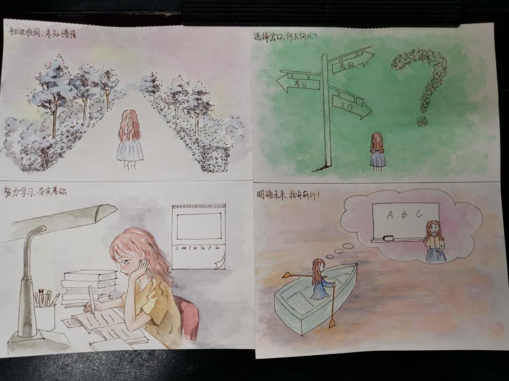 比赛主要采用手绘或者软件绘图的方式,激发同学们的想象力和创造力,定位发展方向,设计实现路径,绘出美好未来。比赛收集“拨云见日,未来可期”、“未来抉择”、“初探职场”、“小桃求职记”、“实步登峰顶”“兢康益学”、“未来,冲呀”等几十幅参赛作品。参赛同学们通过图片、漫画等作品形式展示了追逐社团、参加活动、探索方向的忙碌,展示了明确目标后,熬夜通宵、畅游书海、积极备赛的激情,展示了求职成功、职场小白、驰骋职场,实现梦想的美好憧憬。