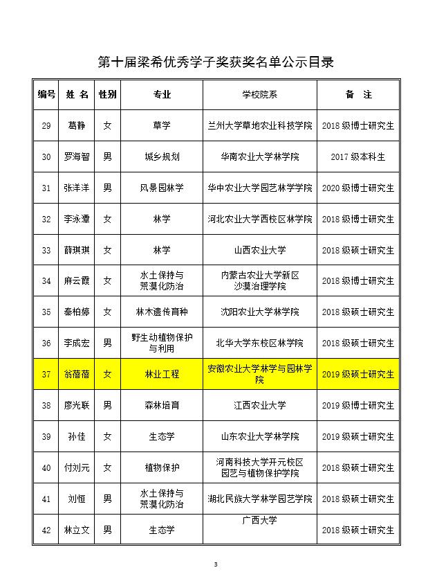 梁希优秀学子奖是梁希科学技术奖的重要组成部分。为纪念著名林学家和杰出林业教育家梁希先生,激励林业高校学生树立“献身、创新、求实、协作”的科学精神,促进林业高校学生全面发展,以及林业和草原的现代化建设。中国林学会根据《梁希科技教育基金管理办法》,设立“梁希优秀学子奖”。 “第十届梁希优秀学子奖”评选活动自2020年11月启动,共收到34所全国林业高等院校和设有林学院的农业大学、综合性大学以及中国林科院研究生院推荐的优秀学子奖候选人100名,经形式审查、专家初审和评审会严格评选,最终评选出51名获奖者。(通讯员:徐玉品)
