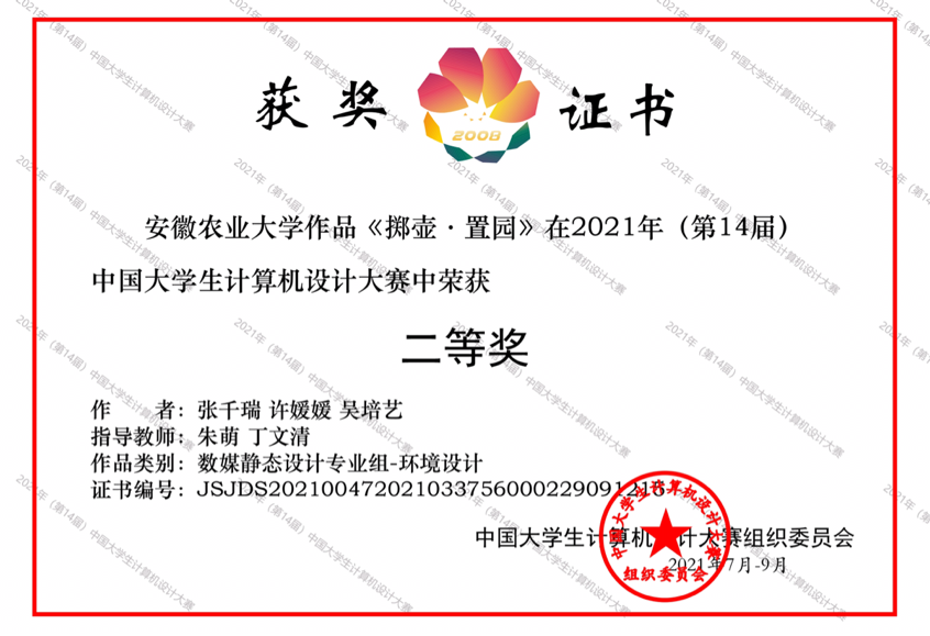 本网讯8月1日, 第十四届中国大学生计算机设计大赛(数媒静态专业组赛道)完美落幕。林学与园林学院2017城乡规划专业的张千瑞、许媛媛和吴培艺三位同学,以专业作品《掷壶.置园》,从省赛走向全国赛,并在大赛中脱颖而出,荣获省级二等奖,国家级二等奖。