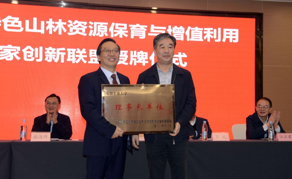 操海群教授首先代表学校对线上线下莅临参会的领导和专家表示欢迎和感谢,对国家林业与草原局和安徽省林业局将我校设立为“大别山特色山林资源保育与增值利用国家创新联盟” 理事长单位表示感谢,对联盟今后的工作做出了要求和部署。安徽省林学会理事长邱辉代表联盟推荐单位感谢国家林业与草原局对于安徽林业工作的支持,对联盟的启动表示祝贺,对联盟推动我省林业基础研究和产业扶持的工作做了具体的要求。国家林业和草原局科技司厉建祝巡视员代表联盟主管单位对联盟的正式启动表示祝贺,并要求参加联盟的单位要切实履行好主体责任,按照国家林草局创新联盟管理有关规定和要求组织开展活动,推动大别山地区山林资源产学研用的深度融合,进一步造福山区人民,为革命老区的高质量发展做出新的贡献。随后举行授牌仪式中,主席台就坐的各位领导将联盟理事长单位、副理事长单位、常务理事单位和理事单位的铭牌分别授予了安徽农业大学、华中农业大学、河南农业大学和皖西学院等联盟发起单位和参加单位。