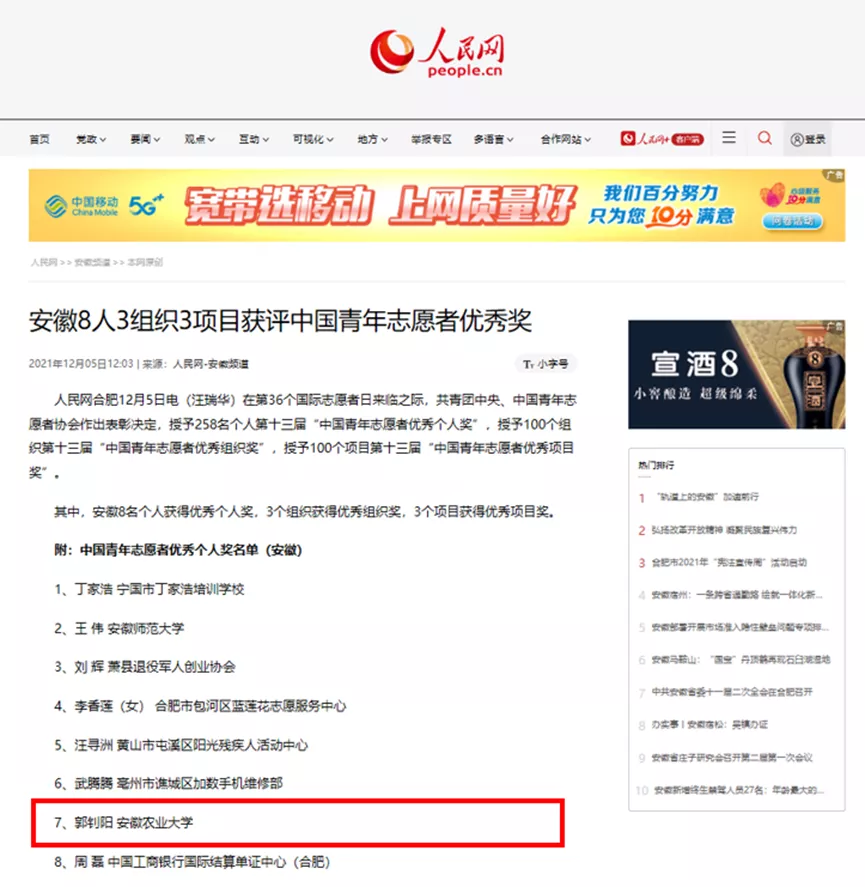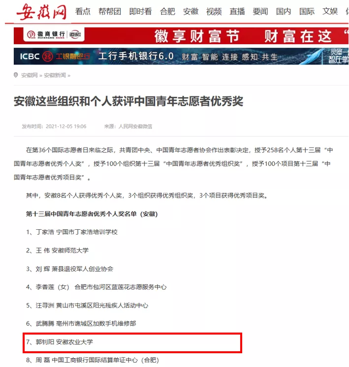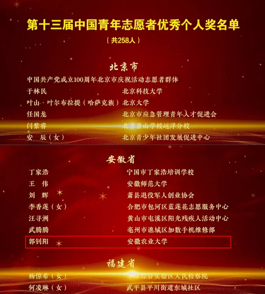 安徽农业大学林学与园林学院团委副书记(兼职)、2018级城乡规划专业郭钊阳同学获评第十三届“中国青年志愿者优秀个人奖”(安徽省高校唯一学生获得者),为安徽农业大学首次获得青年志愿服务领域个人最高荣誉。