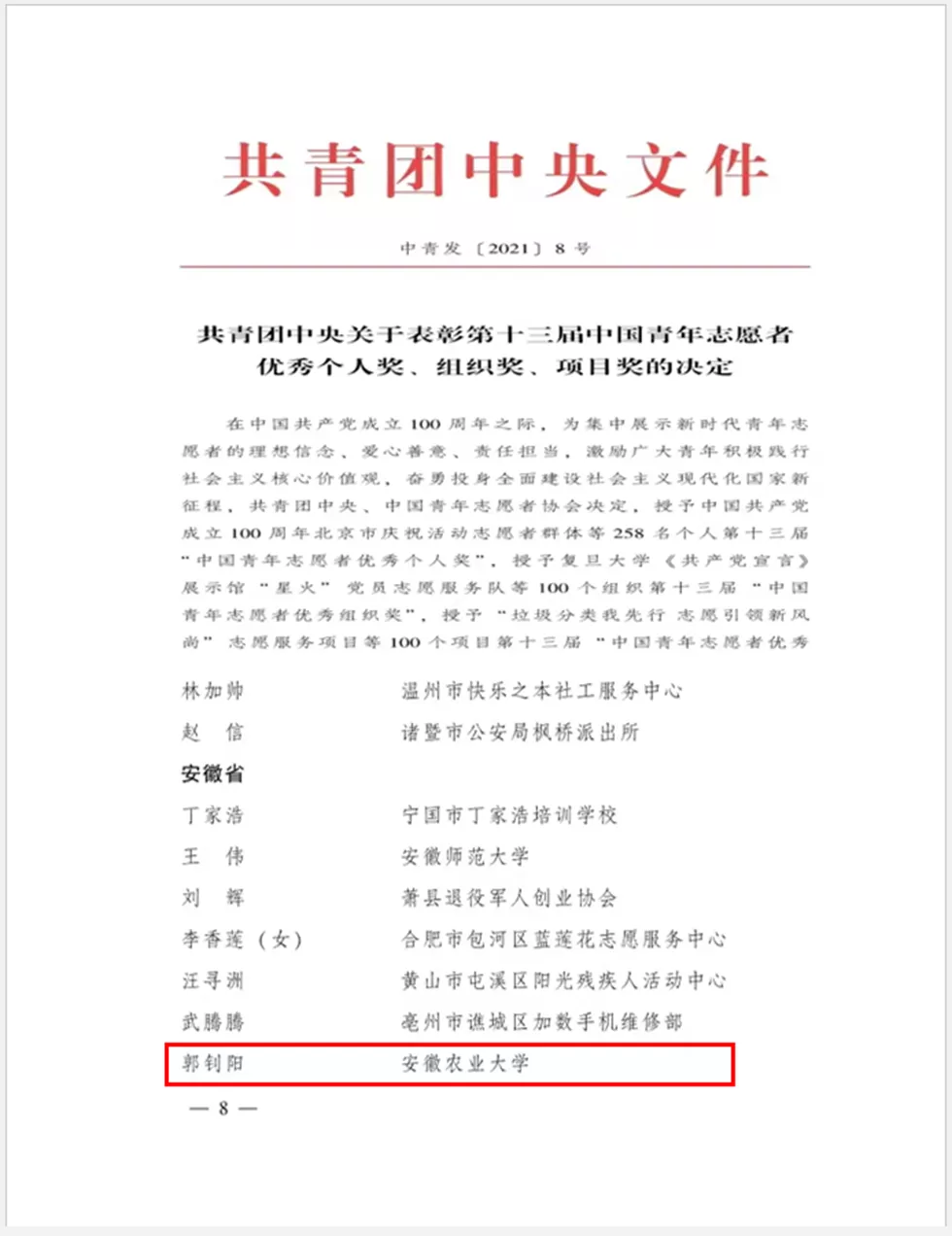 本网讯 在第36个国际志愿者日来临之际,共青团中央、中国青年志愿者协会作出表彰决定,授予258名个人第十三届“中国青年志愿者优秀个人奖”,授予100个组织第十三届“中国青年志愿者优秀组织奖”,授予100个项目第十三届“中国青年志愿者优秀项目奖”。其中,安徽8名个人获得优秀个人奖,3个组织获得优秀组织奖,3个项目获得优秀项目奖。
