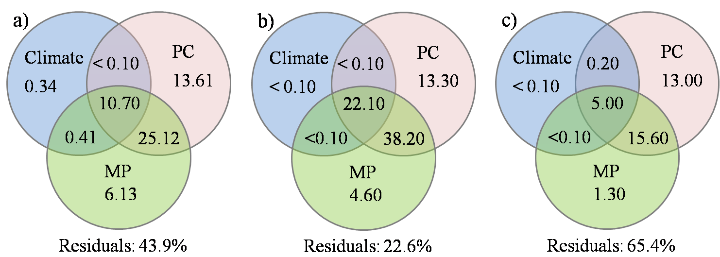 图 2 气候、土壤理化性质和微生物特征在解释(a)样带尺度,(b)热带亚热带和(c)温带森林土壤微生物呼吸方面的方差分解分析。