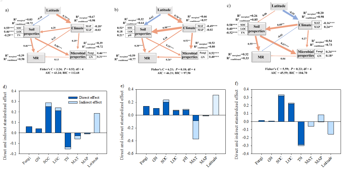 图3分析展示了气候因子、土壤理化性质和微生物特性对(a)样带尺度,(b)热带亚热带森林和(c)温带森林土壤微生物呼吸的直接和间接影响,以及预测因子在(d)样带尺度,(e)热带亚热带和(f)温带森林土壤微生物呼吸的直接和间接的标准化。