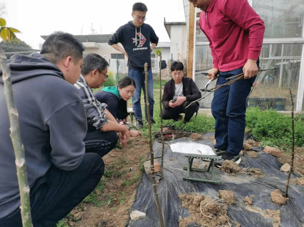 阳春三月,和煦暖心。3月14上午,林学与园林学院校外硕士生导师、四川林业科学院研究员李丕军来农萃园对研究生进行实验指导,并完成不同核桃品种实验材料的嫁接。