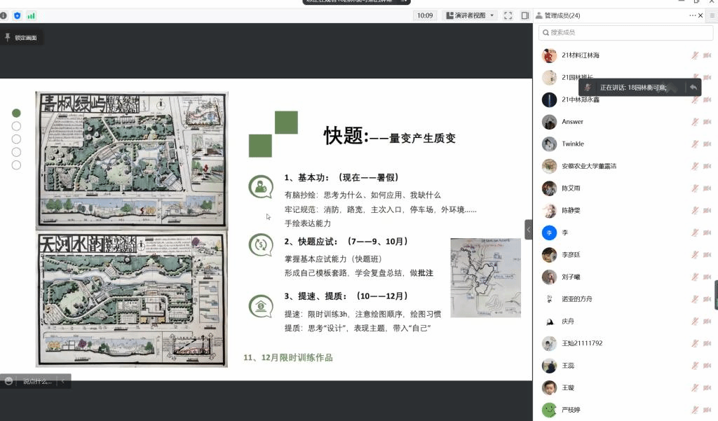 活动主要有学长学姐代表分享经验、答疑互动两个环节开展。首先,18园林专业衡可意分享了自己在学习专业课程时的方法,如画图的先后顺序,以及考研时需要对英语提起重视,在日常就要积累,早日通过四六级。17城规专业王璇则分享了自己考研目标设定、考研计划制定方面的经验,特别分享了时间管理是考研成功的基础保障。18木材专业陶梦雪告诉大家如何调整自己的心态,制定高效的学习计划以适应高强度的研究生生活的学习节奏。而18材料专业董露洁分享了自己本科期间参加学科竞赛和创新创业比赛的经历,告诉同学们免研考研规划要趁早,毕业简历更要从大一开始描绘,让高效的执行力和高度的自律为学业发展保驾护航。最后,18林学专业余洋告诉大家“凡事预则立,不预则废”,要懂得及时调整学习战略,以及最终从备战考研到成功上岸的经历。