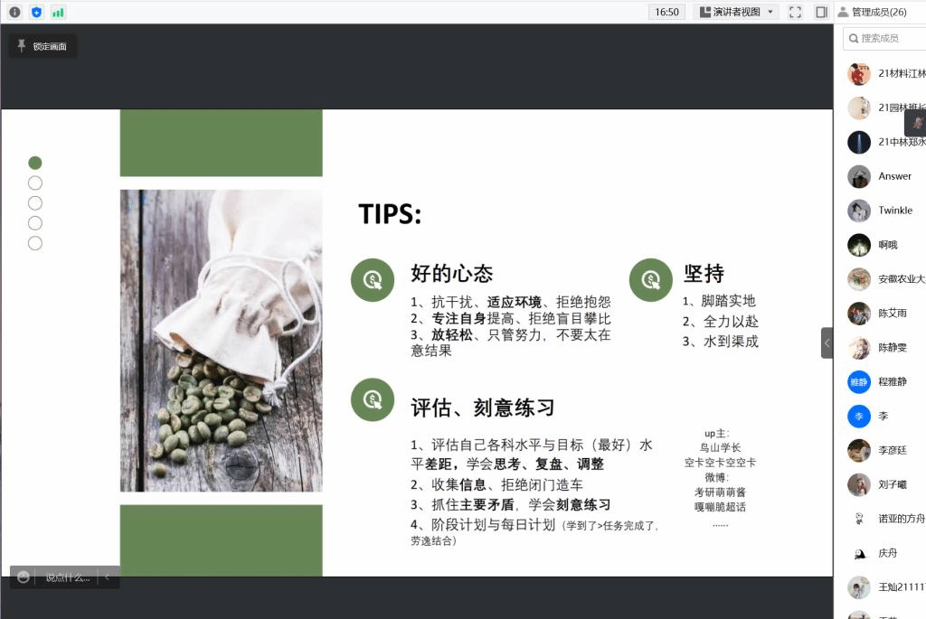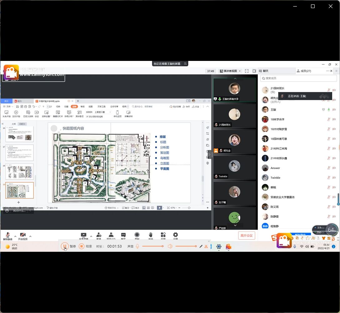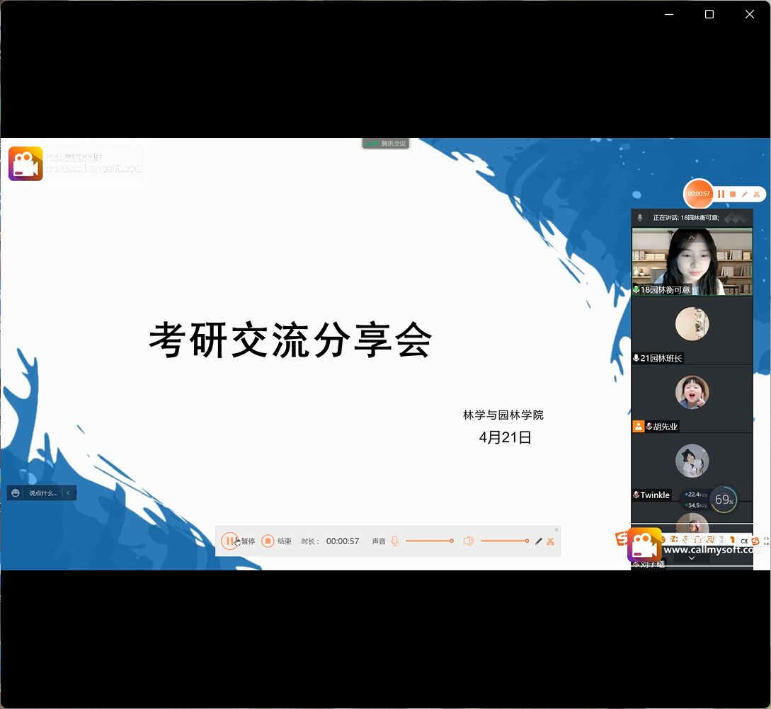 本网讯 为缓解学院学生由学业引起的心理压力,帮助毕业生营造积极向上的学风,帮助学生更好地了解考研和免研政策,明确奋斗目标,林学与园林学院于4月21日晚,在腾讯会议举办学长学姐考研交流分享会。本次活动学院特别邀请五位2021届免研和考研的毕业班学生分享成功经验,学院各年级专业学生参加此次分享会。