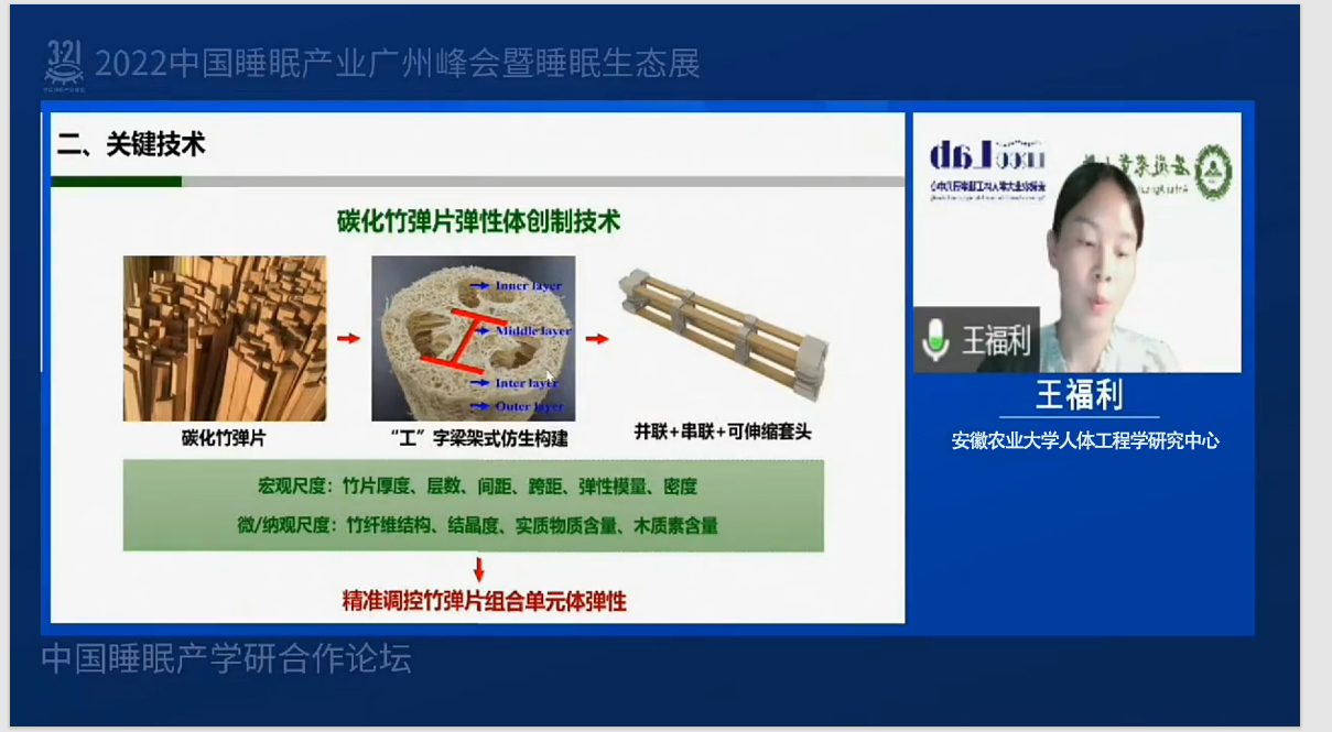 学院人体工程学研究中心的老师依次分享了:丝瓜油基聚氨酯泡沫填充材料制备关键技术。利用改性丝瓜籽油和丝瓜籽多元醇替代石油化工原料,开发了丝瓜籽油记忆海绵,具有生物质含量高、柔软、舒适、支撑性能好、撕裂强度大且高效吸声、高效散湿的优良特性;分享了竹弹簧技术的研究成果与应用案例,所研制的竹弹簧填充材料可“以竹代钢”应用于床具、坐具和枕具等家居产品的设计和开发,并实现了竹弹簧刚性、韧性和透气性的定量化调控以及封闭防霉效果。所开发的竹弹片排骨架通过模块化调控碳化竹弹片的组合方式、碳化程度及其尺寸等可满足不同区域的支撑需求,且缓压效果好,舒适度高,产品使用寿命长;针对床垫缓压分级及睡眠智能识别技术,建立的缓压等级测试与定量化评价装备与方法能够直接评价床垫、枕头对不同人群所起的缓压效果好坏,使不同产品之间的缓压效果可比较,能够为床垫(枕头)的优化设计、定制化生产提供技术支撑,并实现了睡姿及睡眠动作行为的高效自动化识别。技术结合床垫结构与材料性能的定量化评价、床垫支撑性能的自动化调控等,可实现床垫缓压的高端自适应,可应用于老年人智能护理床,用于智能监测、智能调节和智能按摩等。