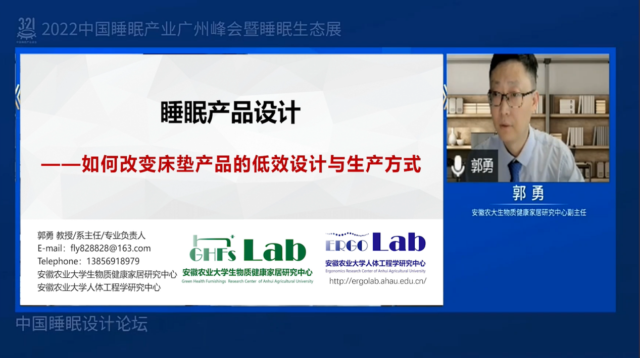 在19日上午的“中国睡眠设计论坛”上,林学与园林学院教授郭勇作为特邀嘉宾做《如何改变床垫产品的低效设计与生产方式》专题演讲。
