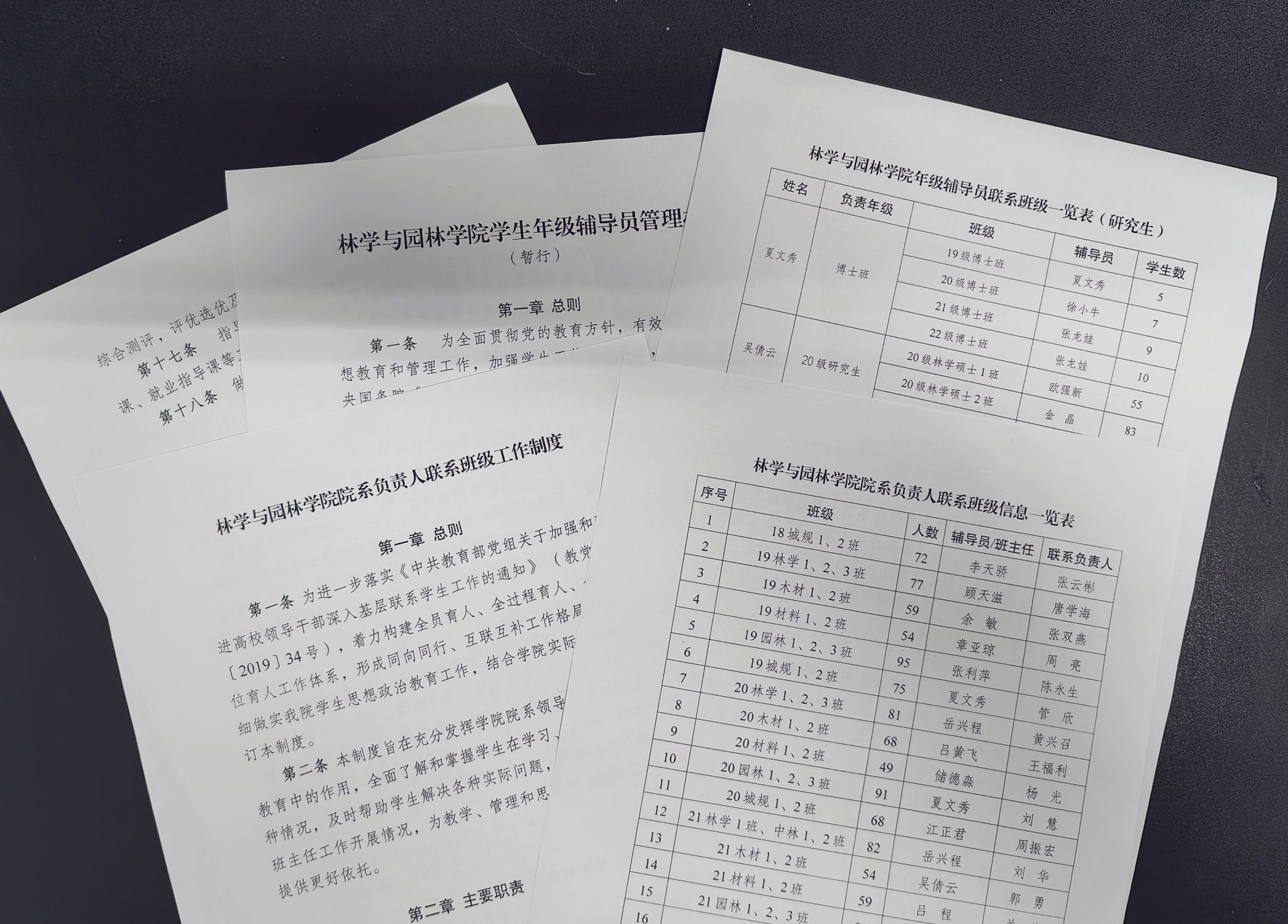 规范工作,制度先行。学院制定《林学与园林学院院系负责人联系班级工作制度》《林学与园林学院学生年级辅导员管理办法》等文件制度,院系负责人、党委委员、系部主任带头联系班级,落实“六个一”工作机制(每学期至少召开一次主题班会、一次学生座谈会、一次随堂听课、一次走访宿舍、一次交流指导、一次工作汇报),全面了解和掌握学生在学习、生活作中各种情况,及时帮助学生解决各种实际问题。