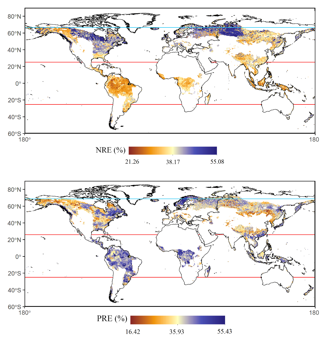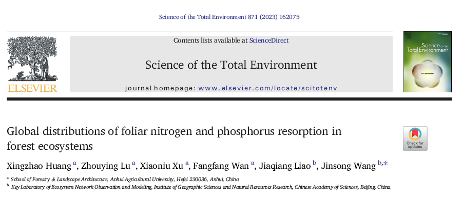 近日,《总体环境科学》(IF=10.753,中科院一区)在线发表了我校林学与园林学院的最新研究成果《森林生态系统中叶片氮和磷再吸收的全球分布》(Global distributions of foliar nitrogen and phosphorus resorption in forest ecosystems)。该研究分析了影响叶片氮养分回流率(NRE)和磷养分回流率(PRE)的生物和非生物因素,预测了全球森林NRE和PRE的空间分布特征。研究结果表明,NRE和PRE在气候带、植物功能群和叶片氮磷比之间有相反的趋势,全球NRE的范围为21%-55%(平均值为38%),PRE的范围为16%-55%(平均值为36%)。NRE和PRE的空间变化分别与N-限制和P-限制相耦合。