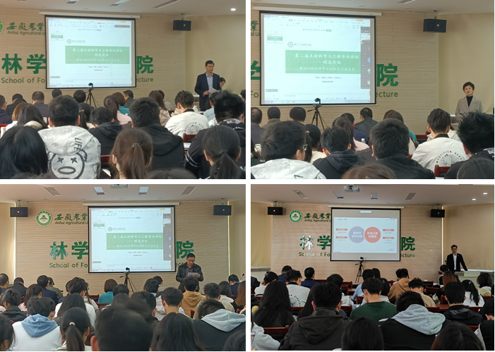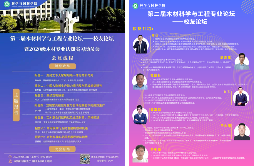 本网讯 4月10日,林学与园林学院第二届木材科学与工程专业论坛暨校友论坛会在林学楼二楼报告厅召开。学院党委副书记夏利明、副院长陆小彪、林产工业系全体教师出席了本次论坛,林产工业系主任郭勇主持。论坛特别邀请7位校友企业专家围绕家具地墙一体化、家具信息化生产技术、人造板、定制家居等主题线上线下同步开展。