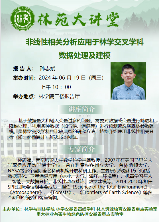 简介:孙志斌,南京师范大学数学科学学院教授,2007年在美国马里兰大学取得应用数学博士学位,曾在科罗拉多州立大学、普林斯顿大学、NASA等多个国际著名科研机构开展科研工作。主要研究兴趣和方向包括:数据同化、卫星遥感应用(林业、大气、海洋、环境等)、机器学习与人工智能、大数据分析、非线性动态系统、数学建模等。2014-2018年担任SPIE国际会议组委会成员,担任《Science of the Total Environment》、《Atmosphere》、《Forests》、《Frontiers of Earth Science》等多个期刊的编委和客座编辑。基于数据量大和输入变量过多的问题,需要对数据或变量进行筛选和降维处理,利用各种数据(如气候、遥感等)进行预测或反演森林参数建模,是林学交叉学科中比较典型的研究方法,特别介绍使用非线性相关分析(如:泰勒展开)解决此类问题。