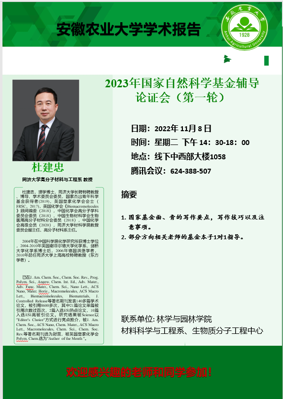 上一条:拓扑聚合物的精准构筑与性能研究 下一条:林苑学术大讲堂(二)——林学与园林学院林产工业系学者系列讲座