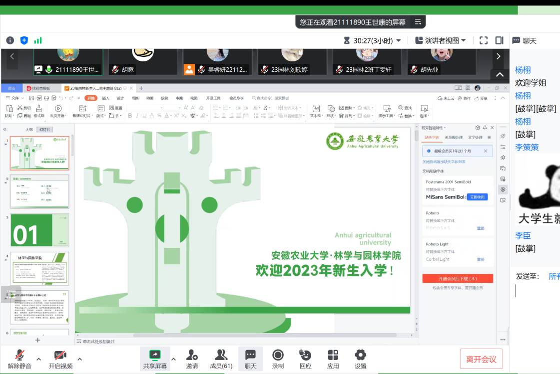本网讯 为2023级园林新生尽快适应大学生活,合理规划自己的大学生涯,组建班集体雏形,9月1日下午特开展23级园林新生入校前线上主题班会。