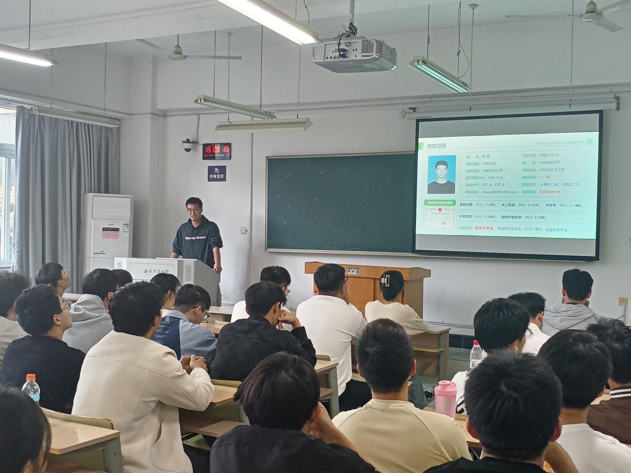 本网讯 为更好引导木材专业学生认真制定学业及成长规划,增强同学们对保研事宜的认识和了解,10月22日下午三点,木材科学与工程专业有幸邀请到了20级木材专业的杨健学长和琚铭萱学姐于博学楼216教室为学弟学妹们分享保研经验。21级和22级木材学生参加此次会议,会议由吴倩云老师主持。
