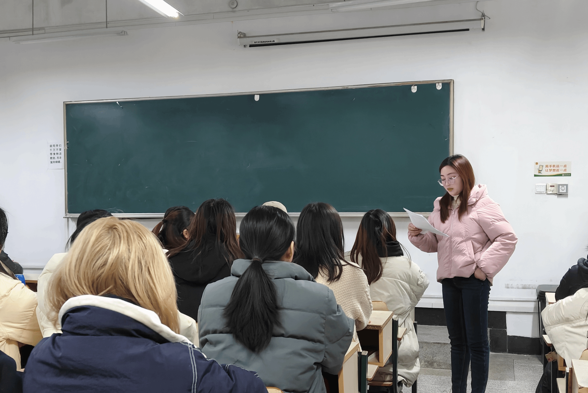 最后,胡老师对我们的日常生活表示了关心,提醒大家在学习之余也要学会适当的放松,做到收放自如。身体是革命的本钱,大家要重视身体健康问题,积极参加乐跑,同时也需保持寝室整洁卫生。
