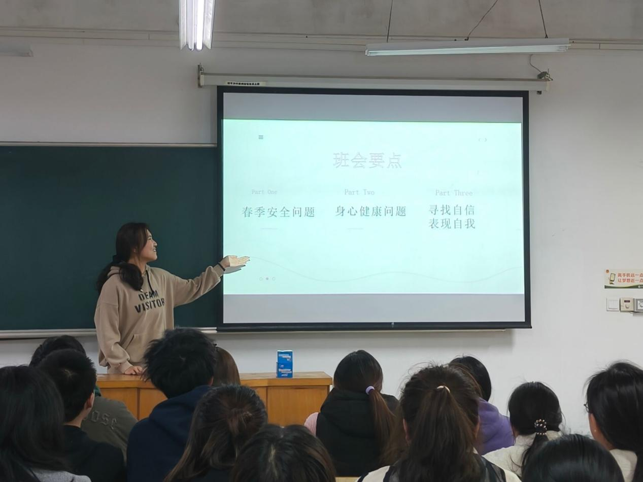 心理健康问题。有科学的研究证明,3—5月是心理问题的多发期,主要原因是春季日照和气温变化大,容易影响人的情绪。加上同学们本学期学习任务较重,可能会有烦躁、郁闷的情绪出现。因此,同学们在学习之余要学会给自己放放松,劳逸结合,学会调节情绪,做情绪的主人。同学们也在班会上积极分享了缓解负面情绪的方法,希望大家都能够以正确的心态面对生活中的困难。