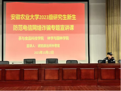 本网讯 10月12日下午,林学与园林学院、茶与食品科学学院在图书馆第一报告厅共同开展2023级研究生新生防范电信网络诈骗专题宣讲,琥珀街道派出所孙建民警官主讲,林学与园林学院与茶与食品科学学院研究生日常管理老师、全体研究生新生参加活动。