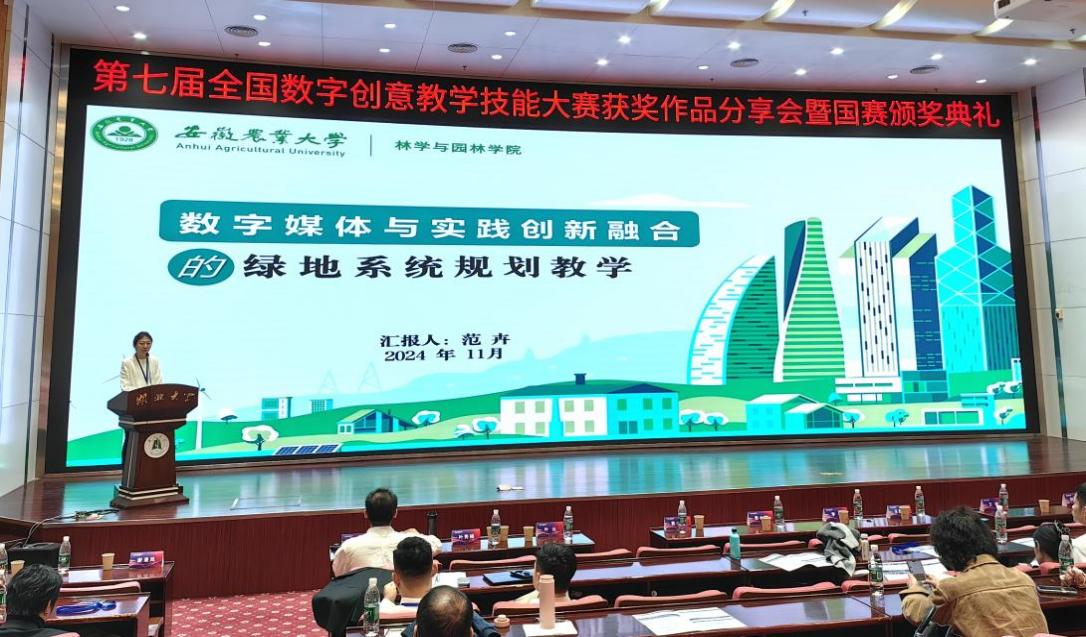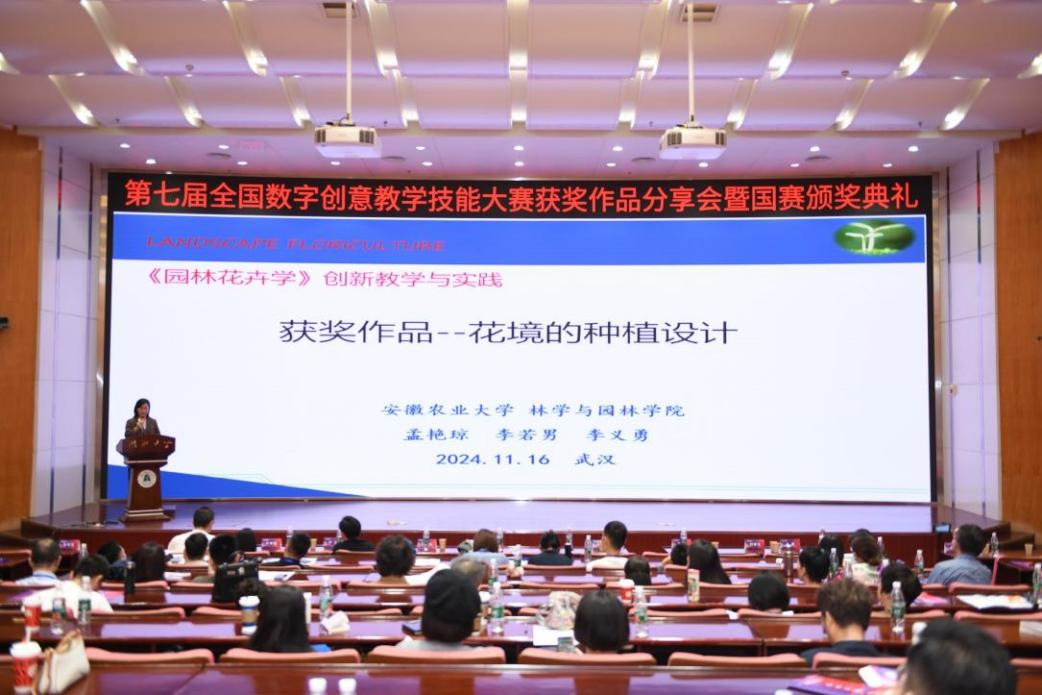 园林系孟艳琼老师提交的作品《园林花卉学-花镜种植设计》、范卉老师提交的作品《数字媒体与实践创新融合的绿地系统规划教学》,凭借独特的创意和卓越的教学效果,在众多参赛作品中脱颖而出,双双荣获国家级一等奖。两位老师在颁奖典礼上分享了获奖作品,介绍了在教学过程中如何将数字创意与专业知识相结合,以及如何通过创新的教学方法激发学生的学习兴趣和创造力,展现了安徽农业大学林学与园林学院的教学能力与教学特色。此外,园林系李莹莹老师的作品《景观生态学》获国家级三等奖,李若男老师的作品《园林道路工程设计》获省级一等奖。