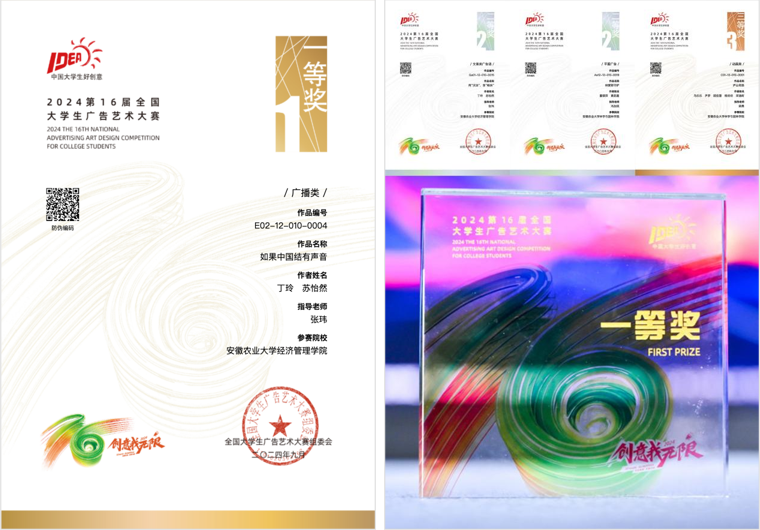 本届大广赛共收到来自全国29个赛区1873所高校报送的77万余组参赛作品,经过学校初评、赛区评选、全国总评审,安徽农业大学学子在本届比赛中共获国家级一等奖1项,二等奖2项、三等奖1项、优秀奖1项,省级1等奖3项、二等奖6项、三等奖12项,取得了“质”和“量”的新突破。我校经济管理学院2021级经济学专业丁玲、林学与园林学院2021级园林专业苏怡然同学共创的广播类作品《如果中国结有声音》荣获全国一等奖,林学与园林学院艺术设计系张玮老师获评“优秀指导教师”称号。