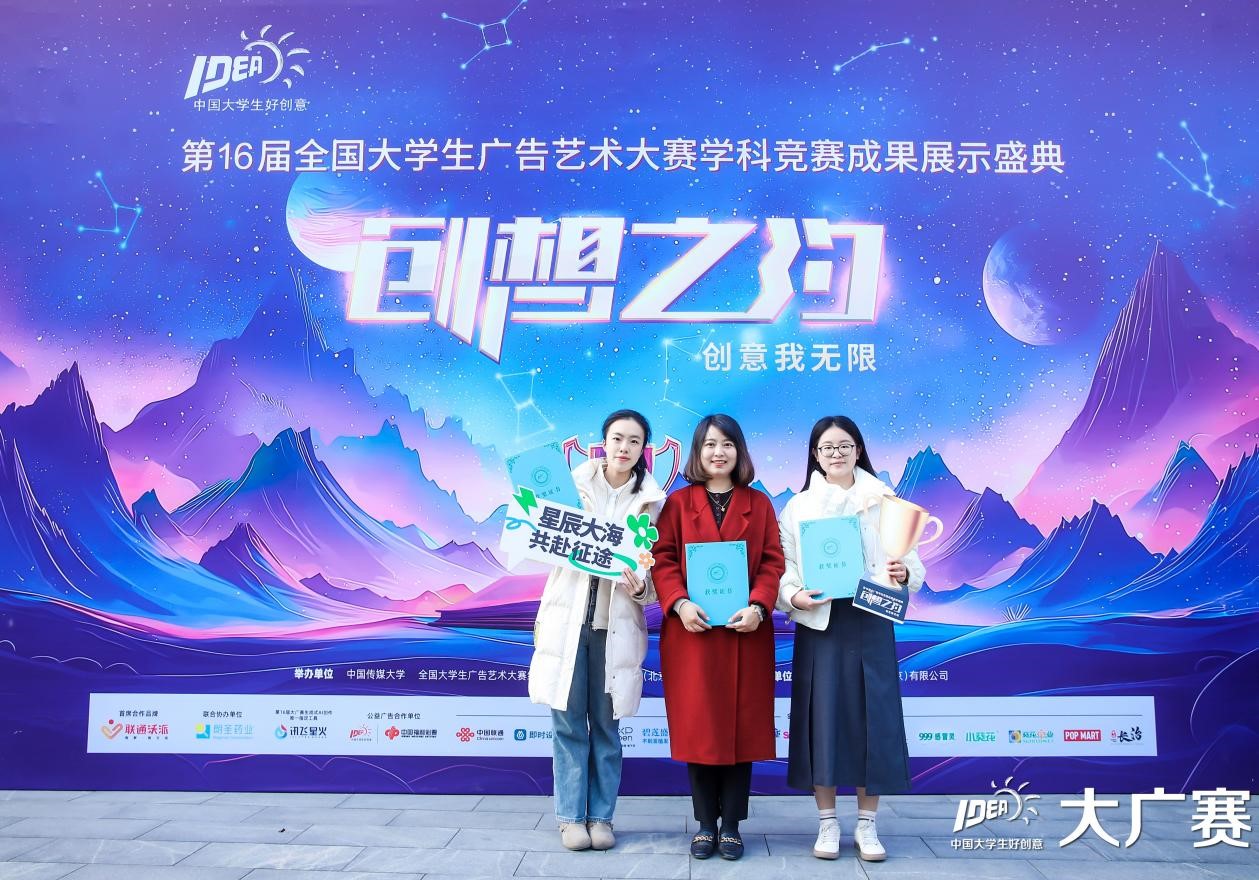 11月23日,第16届全国大学生广告艺术大赛(下称“大广赛”)颁奖盛典在北京东亿国际传媒产业园演艺大楼隆重举行。教育部原副部长、中国高等教育学会原会长周远清,全国人大代表、中国戏剧家协会副主席、国家一级演员、再芬黄梅艺术剧院院长韩再芬,中国高等教育学会副会长、教育部高教司原司长张大良,教育部学生服务与素质发展中心党委书记、主任刘玉光,中国高等院校影视学会副会长兼秘书长张国涛等众多教育界与艺术界的知名人士共70余位嘉宾及来自全国301所院校的近1700名获奖师生代表到场参会,我校获奖学生代表丁玲、苏怡然及指导老师张玮受邀出席,共同见证这一广告艺术教育界的盛事。