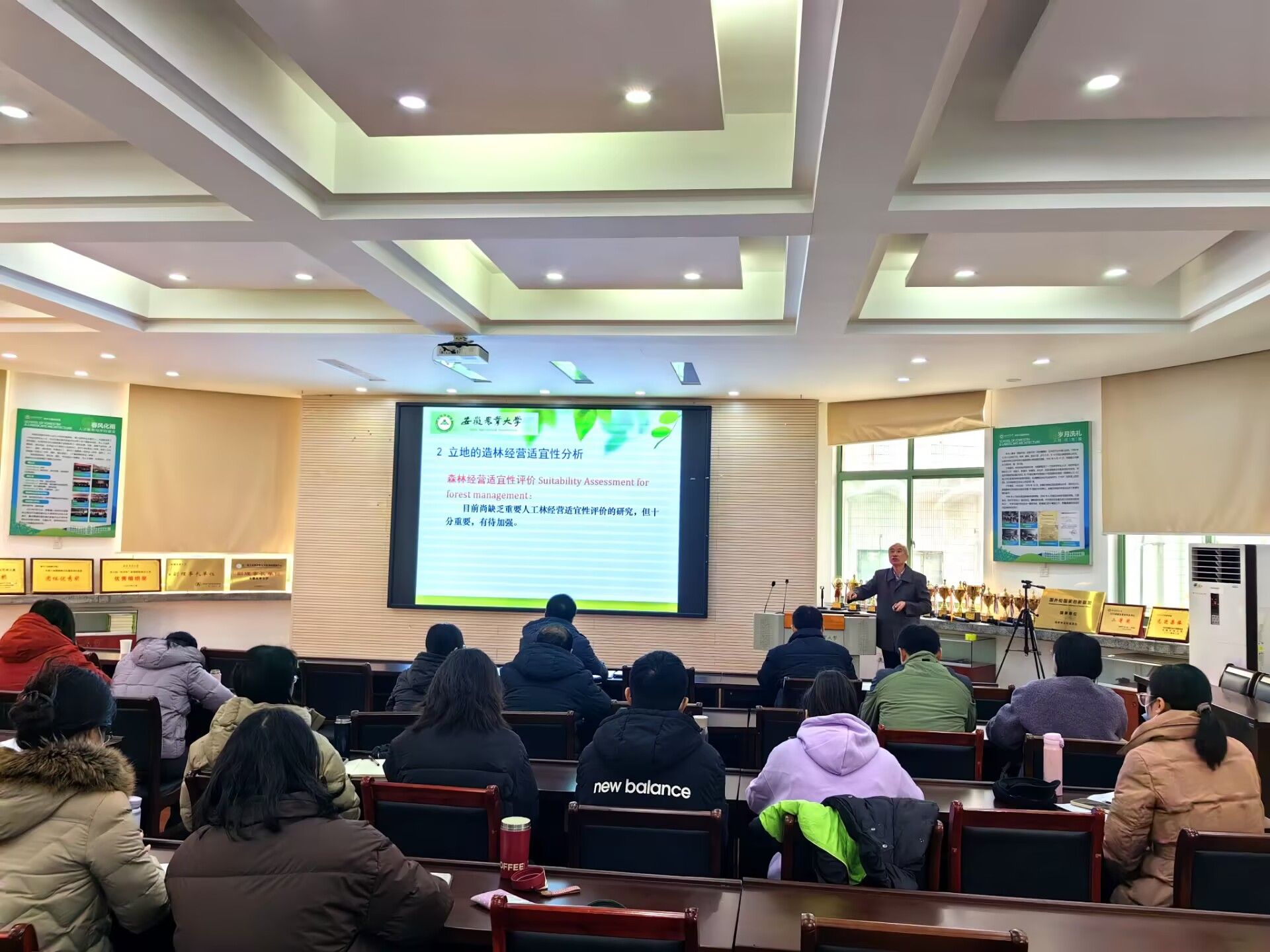 学院退休教师徐小牛应邀为师生们精心准备了“森林与立地条件”专题讲座,他从立地与生境、立地的造林经营适应性分析和森林生产力的影响因素等方面进行了阐释,并结合自己多年教学、科研经历,分享了自己带学生、做学问的点滴,讲座条理清晰、深入浅出,启发了与会教师们科学实践新思路。