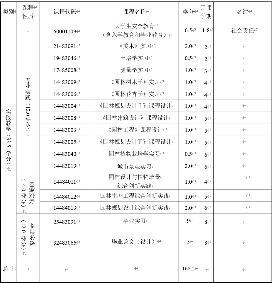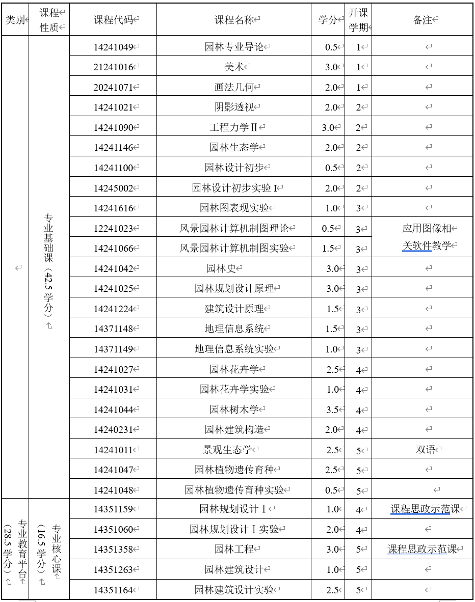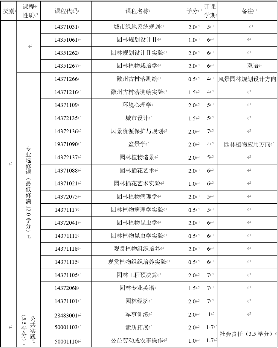 具备正确的思政素养、专业道德和信仰素养,拥有完善的新文科、新工科和新农科的“三新”融合知识体系。突出掌握风景园林规划设计、园林植物应用为专业培养双核心系统知识,具体完备的生态学、花卉学、园林树木学、园林建筑设计、园林工程等方面的基本理论和基本知识,和拥有园林规划设计、园林工程与管理、园林植物繁殖栽培、养护管理与应用等方面的能力。必须修满最低学分。