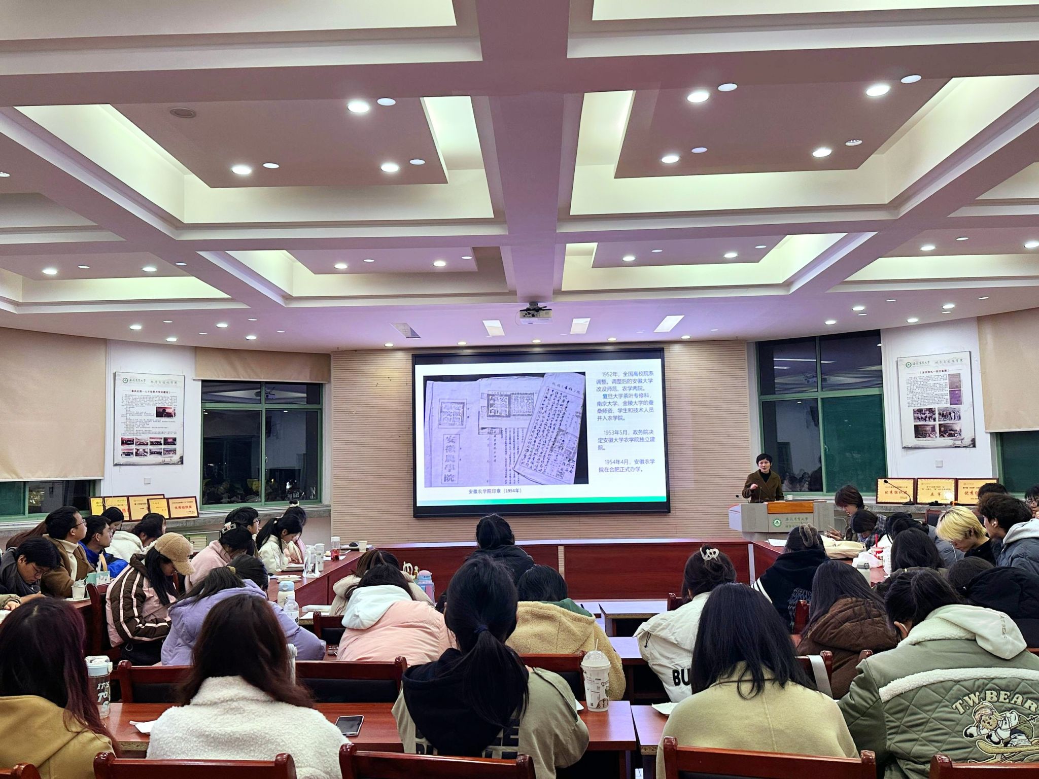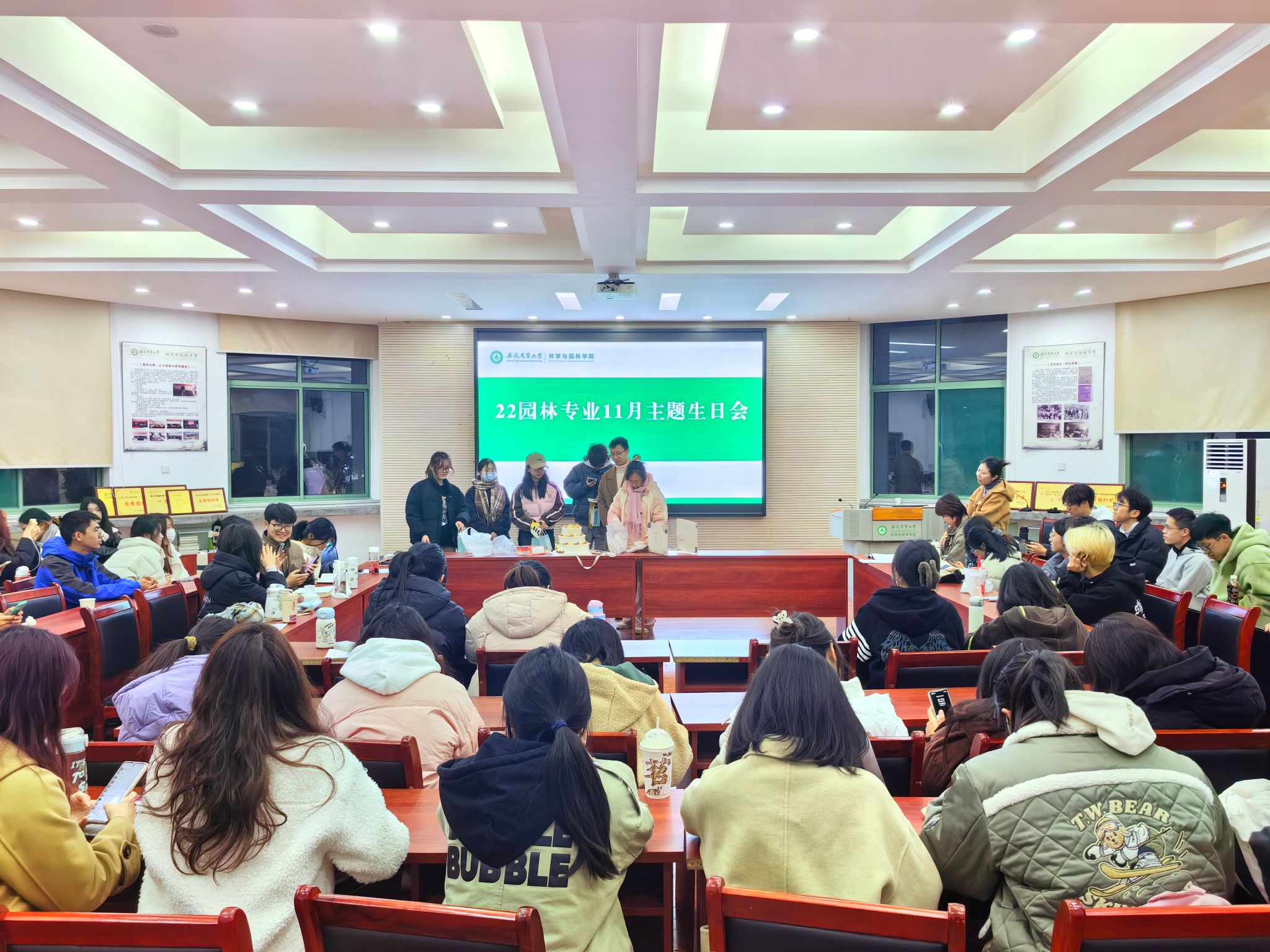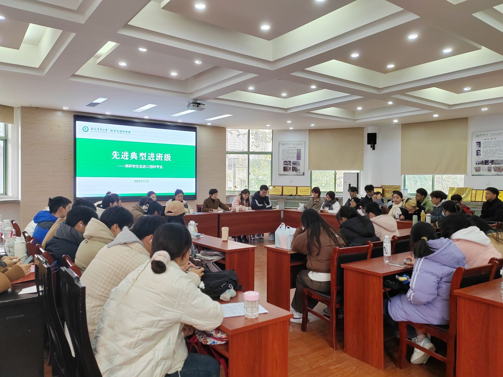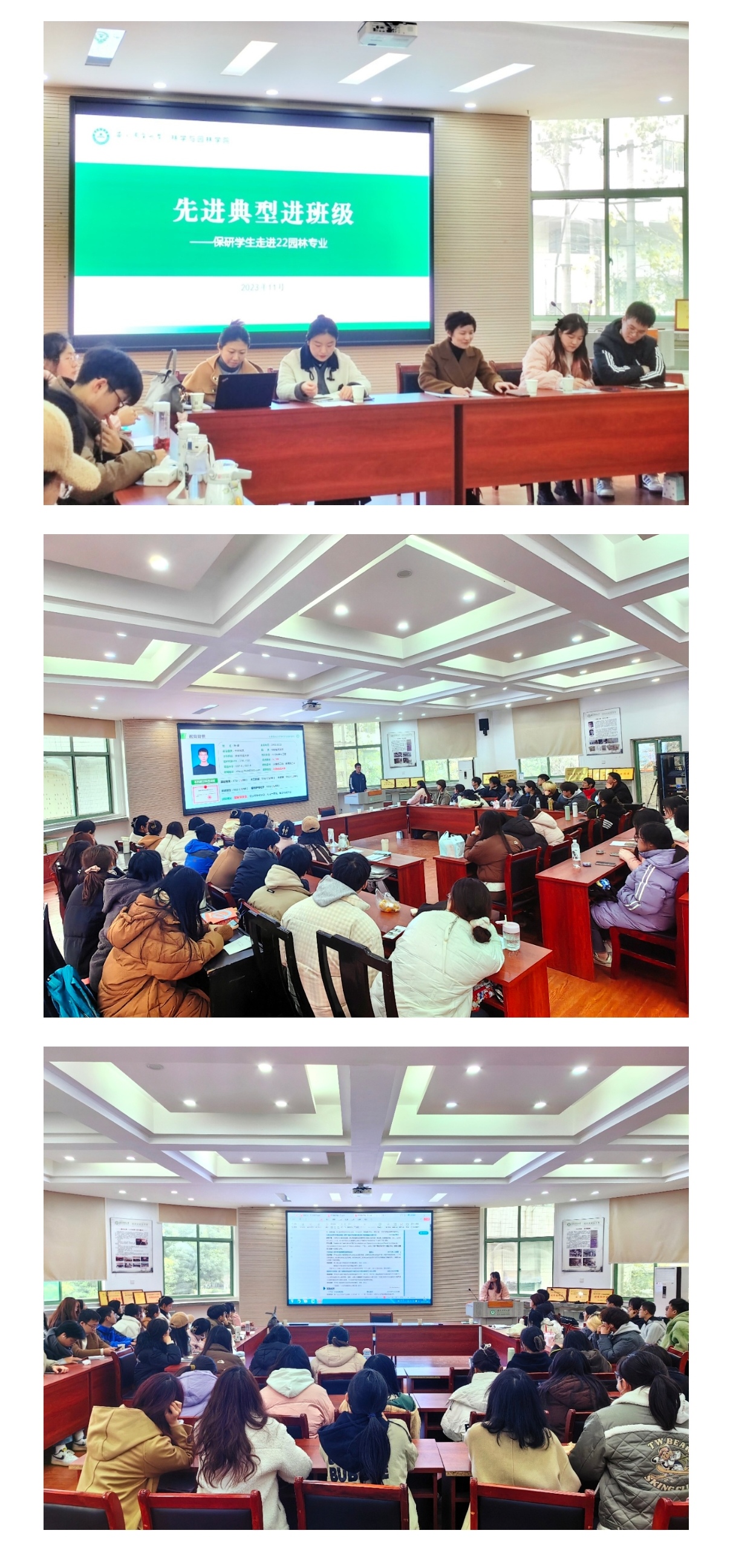 本网讯 11月30日下午,22园林专业在林学楼二楼报告厅开展主题班会。专业辅导员夏利明、班主任范卉、专业全体同学参加,主题班会特邀2024届免试研究生王立伟、何丽娜、杨健同学参会。
