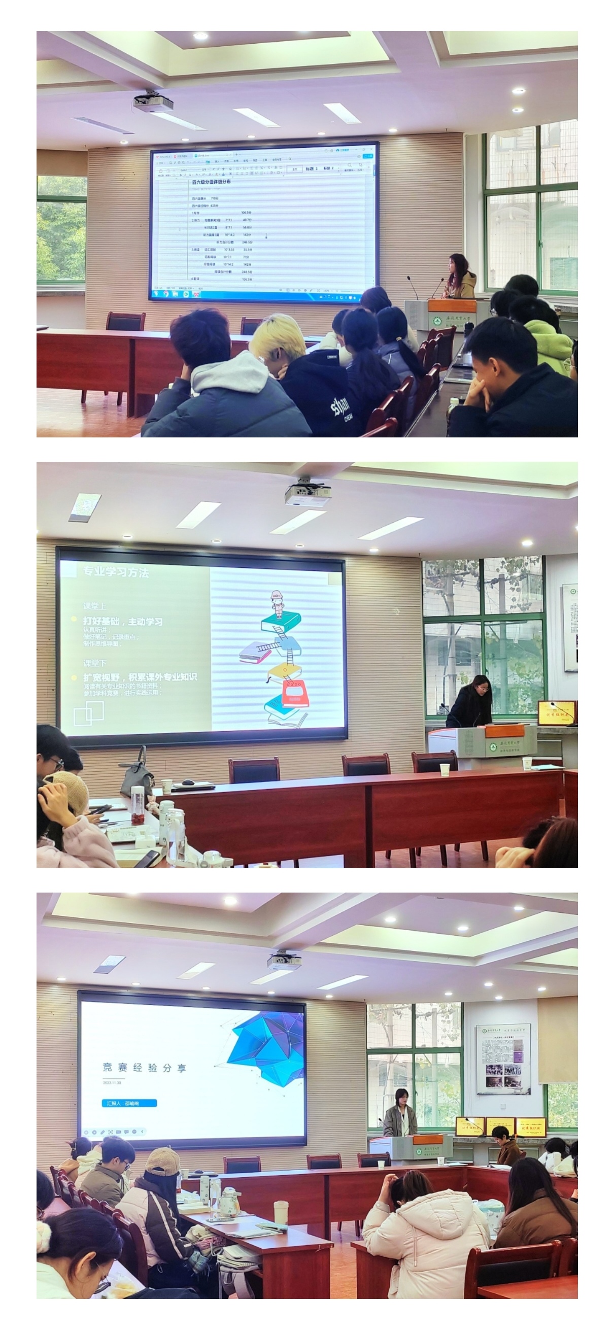 会上,班级同学方秋宇、邵瑜琬、张佳鑫分别分享了在英语学习、竞赛经历、绩点提升等方面的经验做法。方秋宇对四六级方面的学习进行了经验分享,从四六级分数分配,各类题型做题技巧等方面做了详细说明;邵瑜琬通过“大创”“挑战杯”竞赛详细介绍了竞赛的评审规则和评分要求,并提供了相应实用技能;张佳鑫从课堂与课下的学习、考前的复习准备以及高效的学习技巧等方面介绍了学习经验。