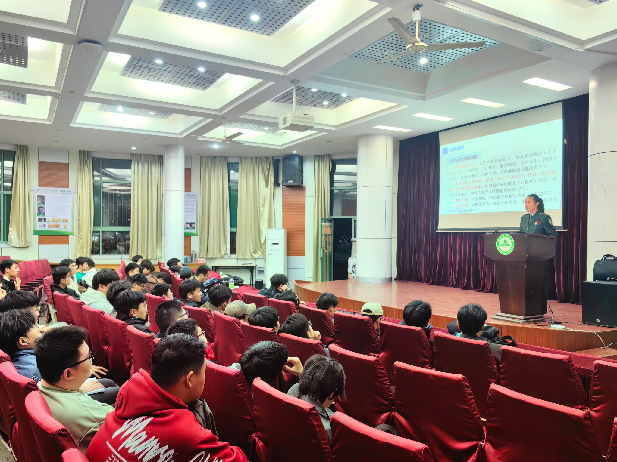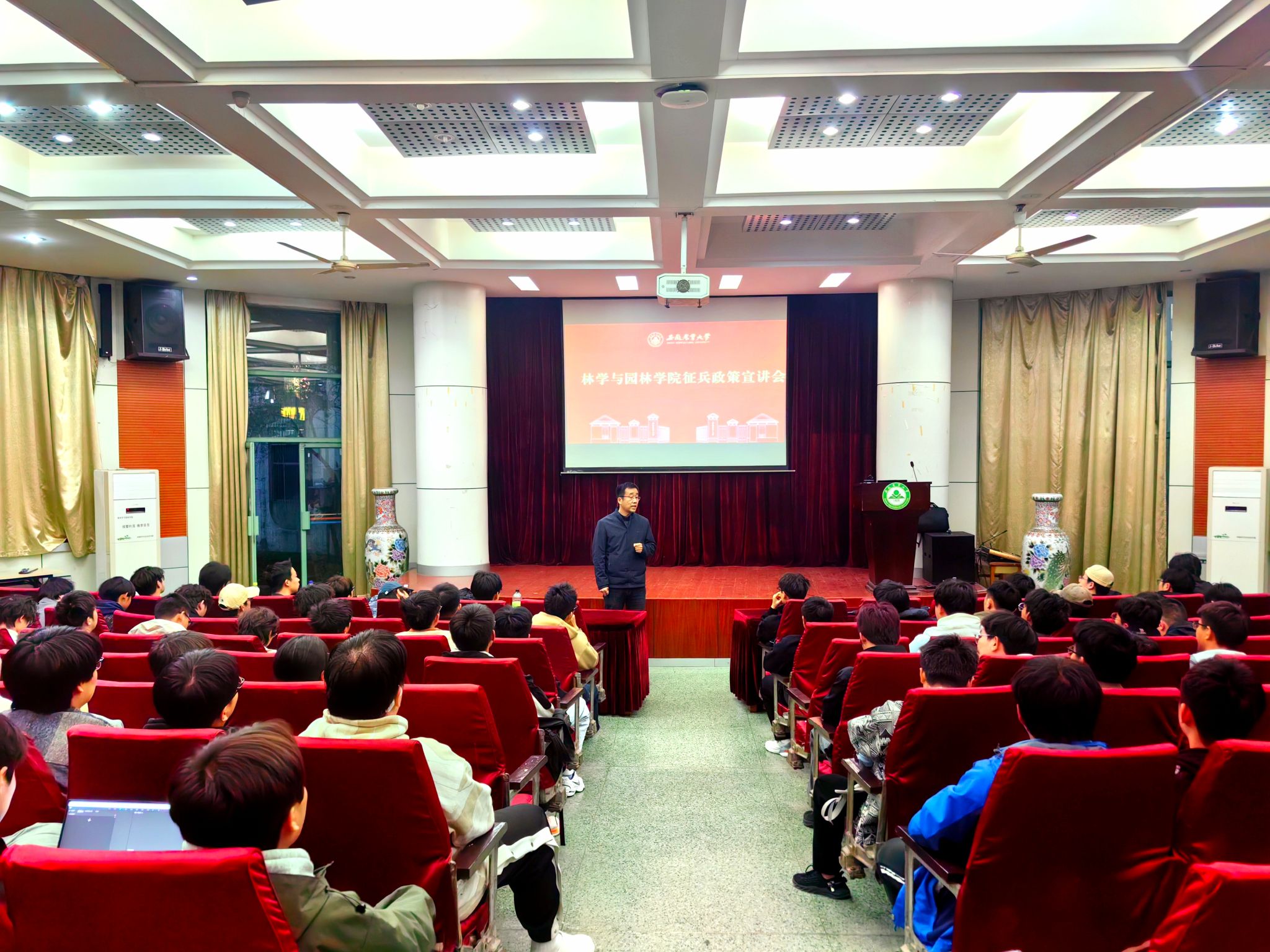本网讯 3月27日晚,林学与园林学院在林学楼一楼报告厅举办“强军有我·2025征兵政策宣讲会”。学院党委副书记陈枫、征兵联络员、退役学生代表及学院22级适龄男生参加活动。