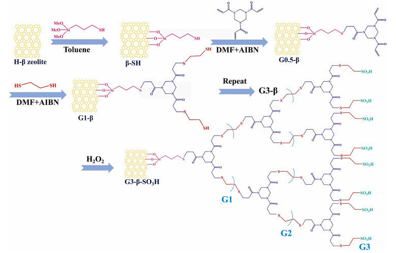 β分子筛作为酸性固体分子筛的典型代表,具有三维十二圆环微-介孔结构,同时具有Bronsted&Lewis酸性位点,且容易进行表面酸性位点修饰。磺酸功能化固体酸催化剂因其低成本,高稳定性而受到广泛关注。
