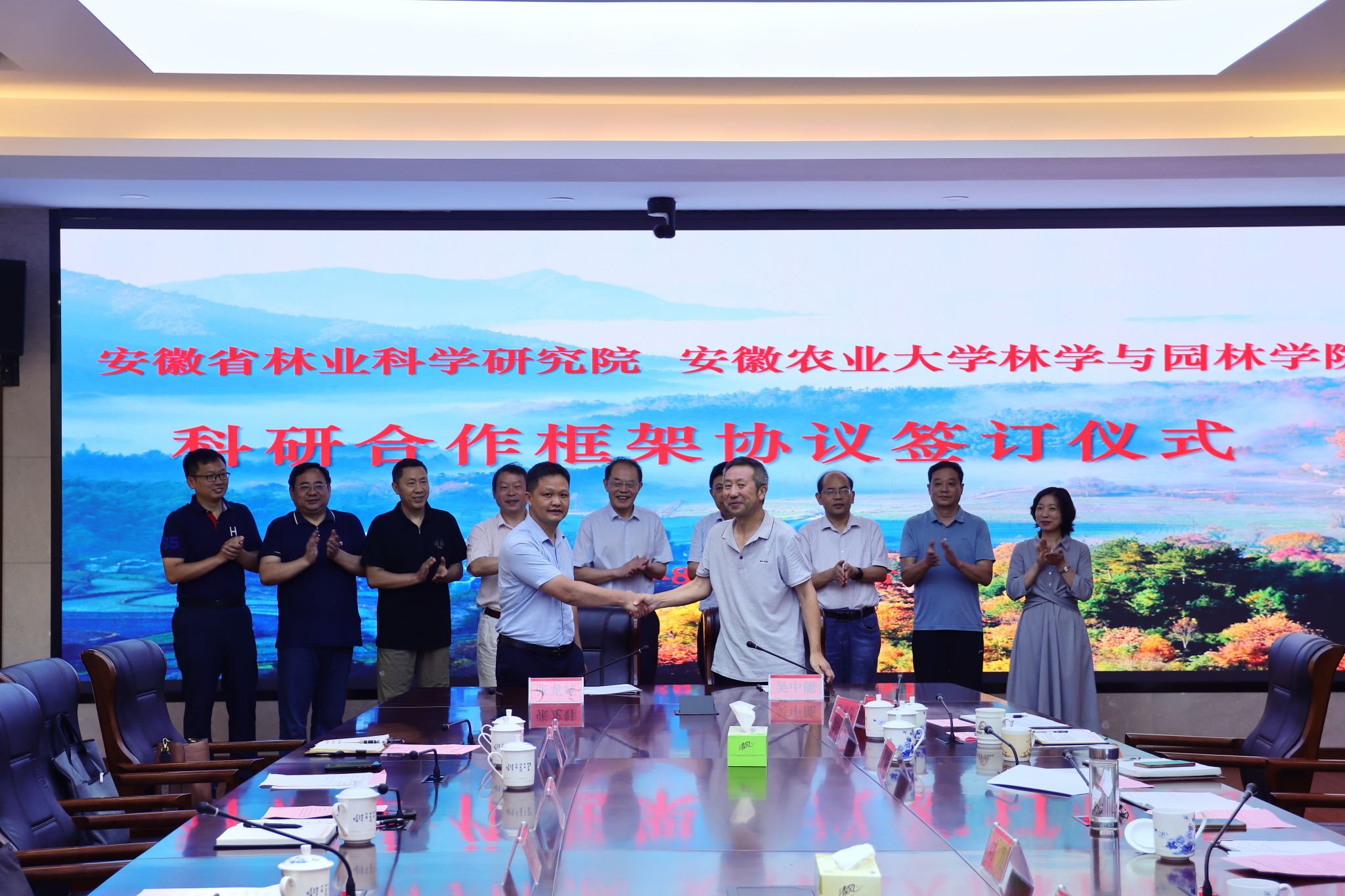 会上,吴中能与张龙娃签署了合作框架协议,双方还就合作具体细节进行深入探讨,包括科学研究、科研平台、资源共用、成果共享、人才培养等方面,标志着林学与园林学院与安徽省林业科学研究院的合作进入了新的阶段。