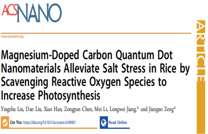 近日,我校林学与园林学院风景园林系特任教授刘颖竹联合湖南农业大学及岳麓山重点实验室曾建国教授团队合作在《ACS NANO》在线发表题为“Magnesium-Doped Carbon Quantum Dot Nanomaterials Alleviate Salt Stress in Rice by Scavenging Reactive Oxygen Species to Increase Photosynthesis”的研究论文,揭示了镁掺杂碳量子点纳米材料通过清除活性氧促进模式作物水稻的光合作用来缓解盐胁迫,为园林植物的抗性胁迫研究提供新思路。