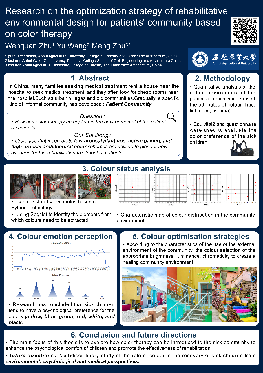 在“环境行为与更健康的人居环境”分论坛上,朱萌和研究生朱文权通过海报,展示了题为《基于色彩疗法的病友社区康复性环境设计优化策略研究》的研究进展。从色彩疗法角度出发,结合心理学分析患儿在社区环境中的色彩偏好,为病友社区提供更加科学、舒适的环境设计策略。