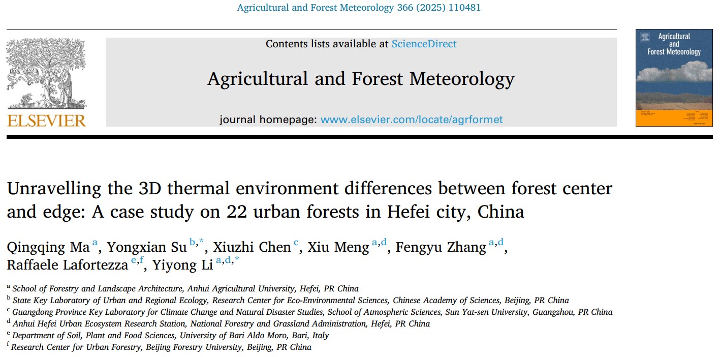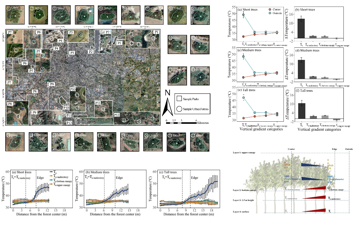 近日,我校林学与园林学院风景园林系李义勇副教授研究团队在Agricultural and Forest Meteorology期刊(中科院一区TOP)上发表了题为 “Unravelling the 3D thermal environment differences between forest center and edge: a case study on 22 urban forests in Hefei city, China” 的论文,揭示了城市森林的三维热环境格局,为城市森林的规划与设计提供了新的科学依据。