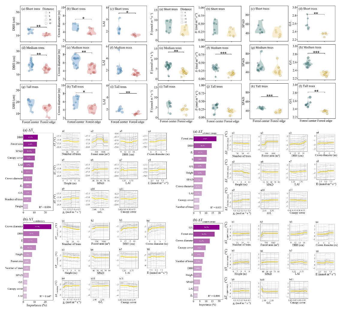 城市森林作为缓解热岛效应的重要生态手段,其降温效应及机制一直是风景园林、城市生态领域的研究热点。该研究沿着森林中心点到外部5米的轴线,以水平间隔0.5m对四个垂直层面的空气温度和相对湿度——地表(Ts)、1.5米处气温(Ta understory)、冠层底部气温(Ta bottom canopy)及冠层上部气温(Ta upper canopy)进行实时监测。研究结果揭示了上述四个垂直层面从森林中心点到边界处的温度变化格局,发现不同树高森林的LTs=Ta understory Lcenter和LTs=Ta understory Ledge(分别表示Ts=Ta understory点到森林中心点、边界点的距离)存在较大差异,同时与森林面积、SPAD、叶面积指数等参数相关。此外,不同垂直层面的森林中心与边界点温度差值不同,ΔTs > ΔTa understory = ΔTa bottom canopy > ΔTa upper canopy,主要受到叶片G/L、胸径、冠幅、森林面积等因子的驱动。该研究首次揭示了城市森林温度环境的三维格局,提出了两个参数(LTs=Ta understory Lcenter和LTs=Ta understory Ledge)用于计算城市森林降温效应的缓冲区,量化了森林结构和叶片功能性状对森林降温效应的贡献。