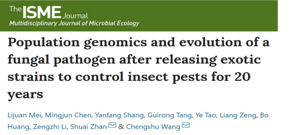 2020年2月28日,林学与园林学院陈名君老师、中国科学院分子植物科学卓越创新中心梅丽娟博士为共同第一作者在中科院一区TOP期刊《The ISME Journal》(影响因子9.493)上发表题为“Population genomics and evolution of a fungal pathogen after releasing exotic strains to control insect pests for 20 years”的研究性论文,通讯作者是中国科学院分子植物科学卓越创新中心王成树研究员和詹帅研究员。