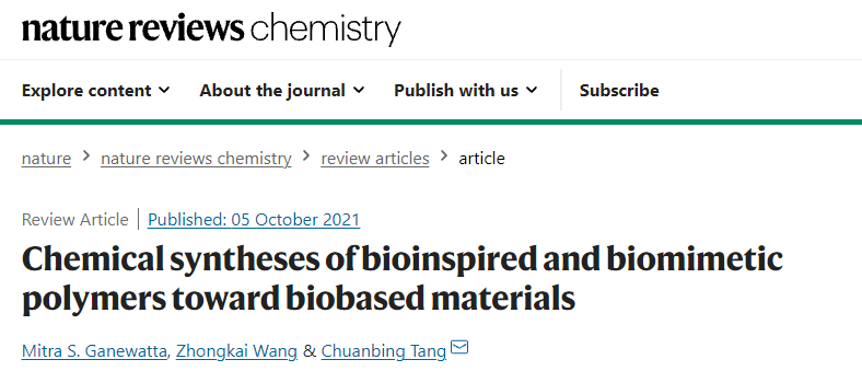 本网讯 近日,安徽农业大学生物质分子工程中心与合作者共同撰写了综述文章,探讨了农林生物基材料在仿生领域的最新进展,并从交联网络、动态相互作用和自组装等角度,提出对生物基仿生材料化学合成的新见解。相关文章以“Chemical syntheses of bioinspired and biomimetic polymers toward biobased materials”为题发表在Nature Reviews Chemistry(Nature子刊 影响因子34.035),汪钟凯教授为本综述共同第一作者。